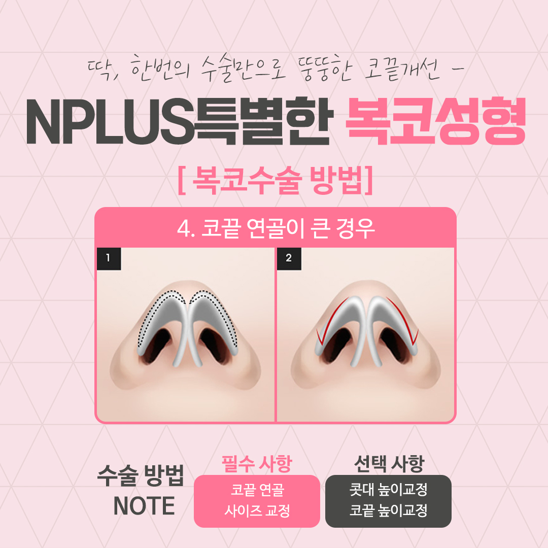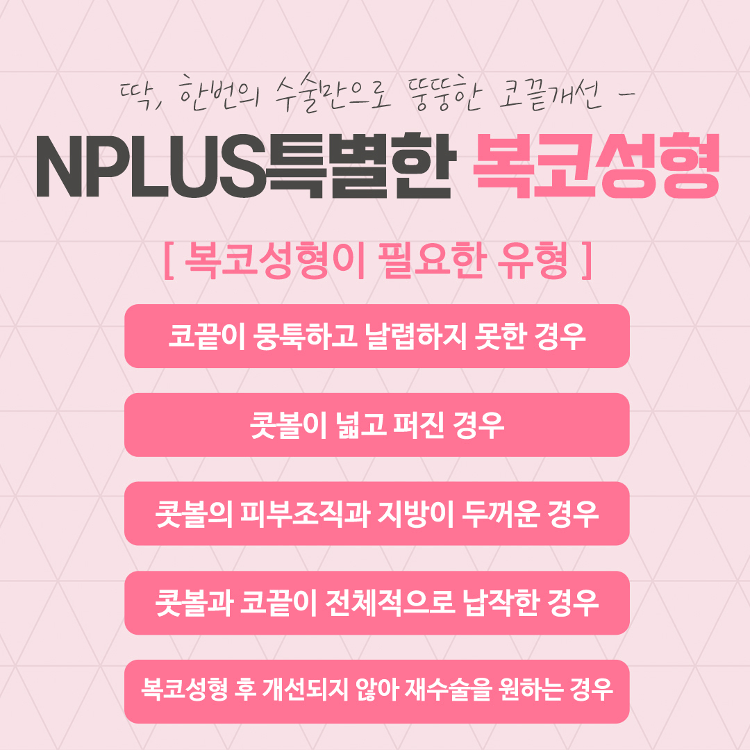 복코성형의 경우 코끝이 뭉툭하거나 날렵하지 못한 경우, 콧볼이 넓고 퍼진 경우, 콧볼의 피부조직과 지방이 두꺼운 경우, 콧볼과 코끝이 납작한 경우, 복코성형을 시도하였지만 개선되지 않은 경우와 같이 구분할 수 있으며, 다양한 원인에 따라 코지방제거, 코끝 연골묶기와 같은 다양한 수술법을 통해 개선을 진행할 수 있습니다.