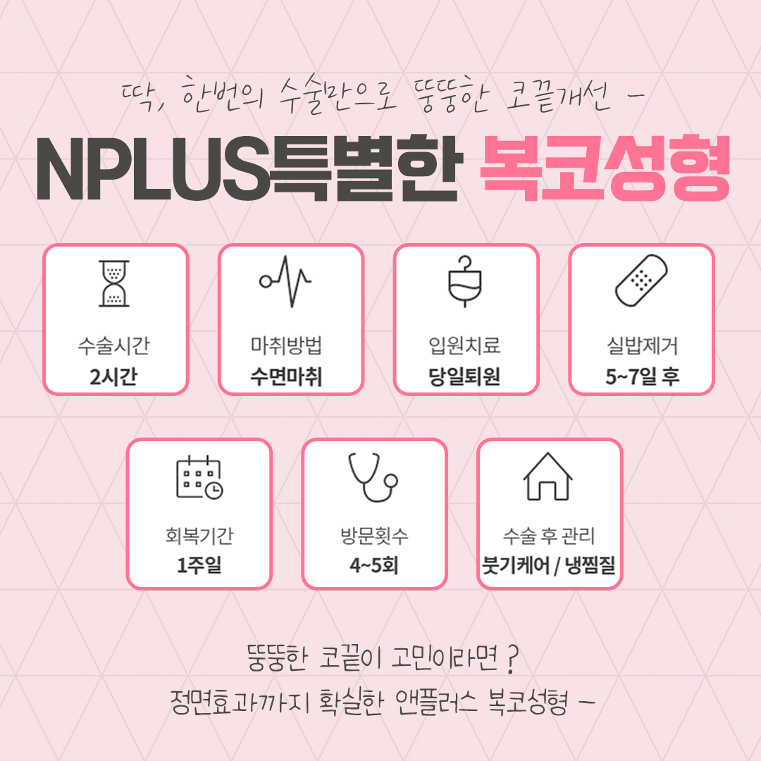 실하게 보장받아 보실 수 있습니다. 오지코성형외과 앤플러스에서 진행된 코지방제거를 통한 복코성형에 대해 설명드렸는데 코의 모양이 마음에 들지 않아 코성형에 대한 내용을 찾아보고 계시는 분들에게 이 글이 많은 도움이 되셨으면 좋겠습니다. 감사합니다.